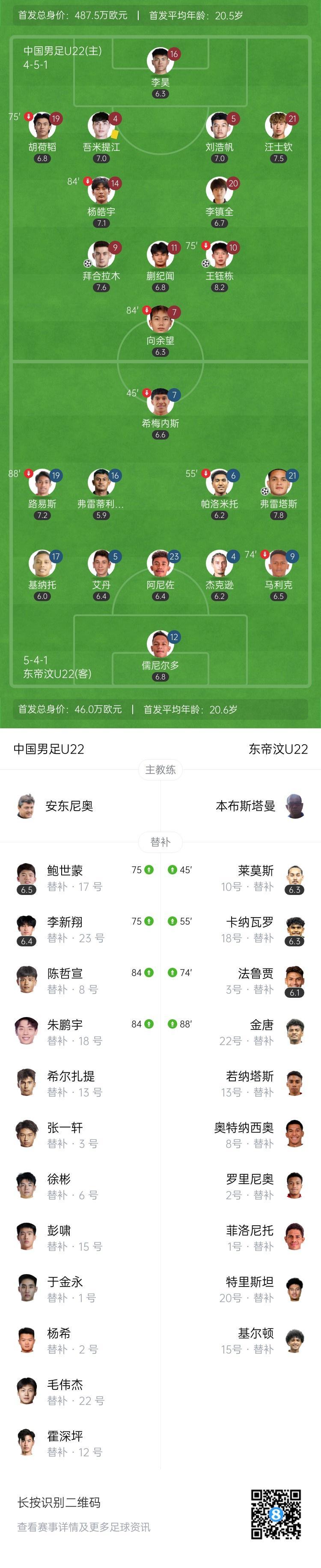直播吧9月3日讯 直播吧9月3日讯 北京时间19:35,U23亚洲杯预选赛第1轮,中国男足U22vs东帝汶U22,比赛在西安国际足球中心打响!上半场,拜合拉木破门;半场结束前王钰栋反击兜射得手。下半场,向余望三度错失良机,东帝汶扳回一球!最终,中国男足U22首战2-1险胜弱旅东帝汶U22,艰难取得开门红!下场比赛将迎战北马里亚纳群岛U23。